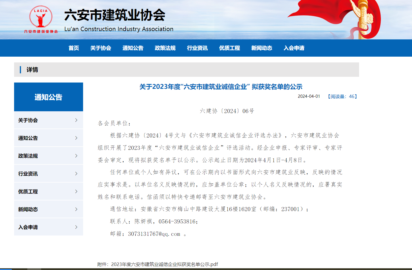 2023年度六安市建筑業誠信企業擬獲獎名單公示